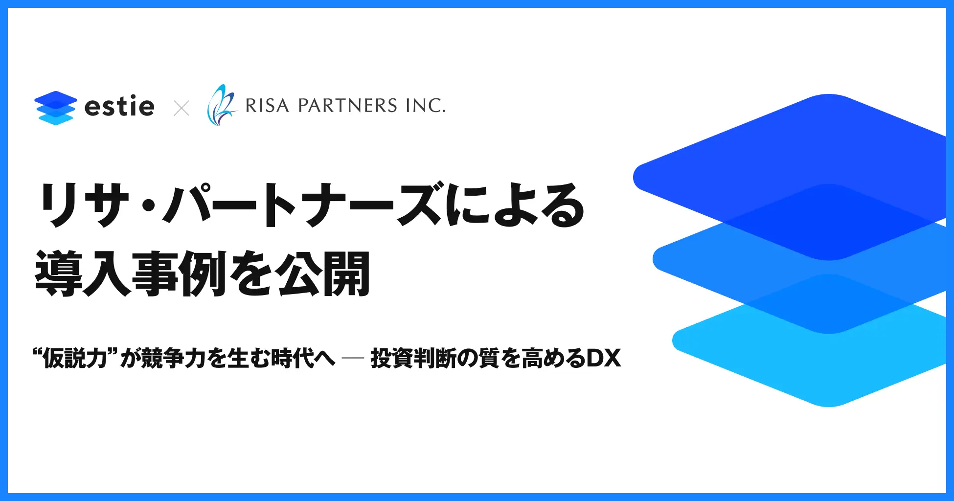 日本最大級の商業用不動産データ分析基盤「estie マーケット調査」を中心に複数のサービスを提供する株式会社estie(本社:東京都港区、代表取締役:平井 瑛、以下「estie」)は、 「estie マーケット調査」「estie 案件管理」「estie レジリサーチ」の3サービスをご導入いただいた株式会社リサ・パートナーズの事例インタビュー「 “仮説力”が競争力を生む時代へ──リサ・パートナーズがestieと共に挑む、投資判断の質を高めるDX 」を公開しました。